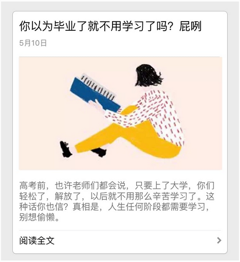 很多時候,用戶更加需要有思考和觀點的社交文案,因為大多數(shù)人不知道該怎么表達或者怎么行動,你的觀點很有可能給他們帶來指引和方向。比如咪蒙推送的《你以為畢業(yè)了就不用學習了嗎?屁咧》,很明確地向我們表達了她的觀點:即使畢業(yè)了也要學習。